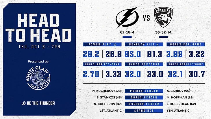 Аргументы: Tampa Bay Lightning открывает сезон домашним поединком против Florida Panthers, которые в межсезонье подписали одного из лучших голкиперов лиги Сергея Бобровского. Данное подписание в сегодняшнем матче сыграло бы на руку Panthers, если бы не одно но, а именно – голкипер хозяев площадки Андрей Василевский, который является лучшим голкиперов НХЛ #прямосейчас. Отметить хочу, что менеджеры Tampa Bay Lightning собрали космический состав, который заслуживает Stanley Cup #прямосейчас.