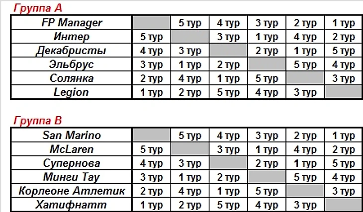 FP Manager (3) и Интер (4) - в А, San Marino (1) и McLaren (2) - в В