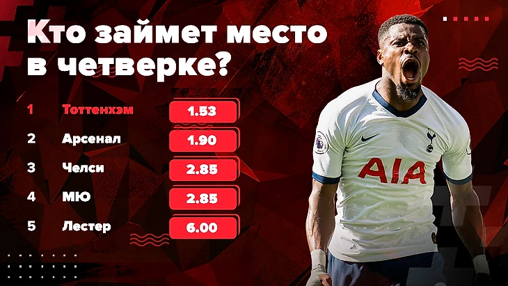 Вот здесь все стало куда-интереснее. То, что “Ман Сити” и “Ливерпуль” завершат место в топ-4, было понятно еще до старта сезона. После них с чуть лучшими шансами, чем у других, шел “Тоттенхэм” (1.50). И несмотря на два поражения на старте чемпионата от “Ньюкасла” и “Лестера”, “шпоры” продолжают лидировать в этой гонке лузеров (1.53 дает Париматч на попадание команды Почеттино в четверку сильнейших по итогам сезона). Намного улучшил свои позиции “Арсенал”, и это во многом заслуга победы над “Астон Виллой” в меньшинстве. Команда набрала одиннадцать очков, отставая от второго “Ман Сити” всего на два пункта. И если раньше “канониры” уступали “Челси” и “МЮ” в котировках букмекеров, то сейчас коэффициент на попадание в Лигочемпионскую зону упал с 2.17 до 1.9.