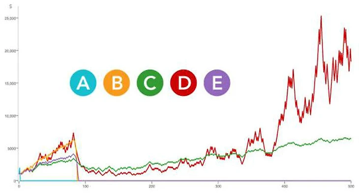 На этом список на самом деле только начинается, но здесь упомянуты все самые популярные финансовые стратегии. Также для ознакомления прикрепляю график, на котором изображены результаты 5 стратегий на дистанции в 500 ставок: