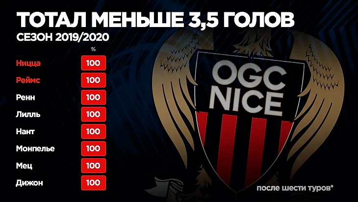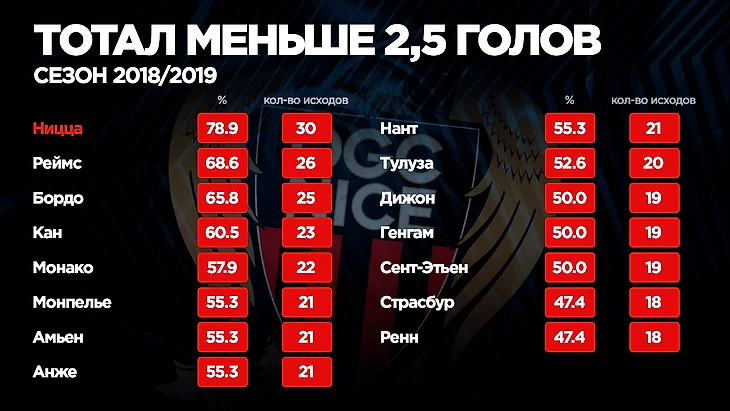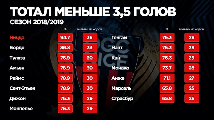 Их шикарная игра привлекла множество “женихов” в летнее трансферное окно, но нам “доги” не были столь интересны, т.к. во всех ставочных рейтингах болтались около лидеров или в середине таблиц. Другое дело — “Ницца”. “Орлы” уже три сезона остаются за бортом еврокубков, то же самое произошло и в прошлом розыгрыше Лиги 1, но низкая результативность команды оказалась по душе любителям беттинга. Можете ли вы представить, что в сезоне 2018/2019 в матчах с участием “Ниццы” прошла ставка на тотал менее 3,5 голов в 94,7% случаев! Только дважды за весь чемпионат в играх этой команды забивалось четыре и более мячей.
