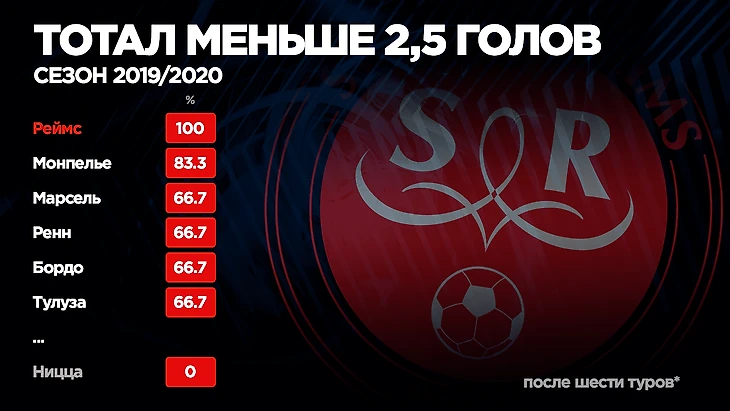 Итак, в первенстве 2018/2019 игроки, ставившие в матчах с “Реймсом” на тотал меньше 3,5 голов получили 78,9% успешных исходов, а при классической схеме в 2,5 мяча — 68,4%. Это третий и второй показатель в лиге соответственно. Тенденция продолжилась и в этом году. За шесть туров “Реймс” сумел стать единственной командой Лиги 1, имеющей 100-процентные показатели в обоих параметрах. Кажется, мы нашли самую низовую команду чемпионата Франции на ближайший год.