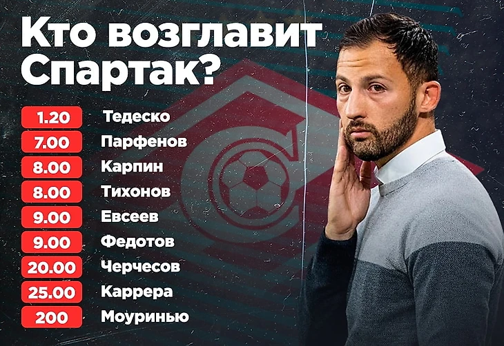 Считалось, что именно Черчесов возглавит "Спартак", но случится это летом после Евро-2020. Судите сами: у него отличные отношения с гендиром красно-белых Томасом Цорном, он довольно часто появляется в ложах с Федуном, имеет большой вес в российском футболе и вообще супертоп. Добавьте сюда слухи о том, что Черчесов не собирается продолжать работать в сборной после чемпионата Европы, и получится так, что других вариантов быть не может - тренер окажется в "Спартаке". Но, скорее всего, он будет не следующим тренером красно-белых, а следующим после следующего. Пока же кэф на его назначение — 20.0.