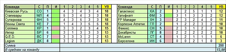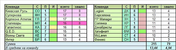 Команды, использовавшие наибольшее число вариантов: Киевская Русь, Супернова, Корлеоне Атлетик (по 17 вариантов)