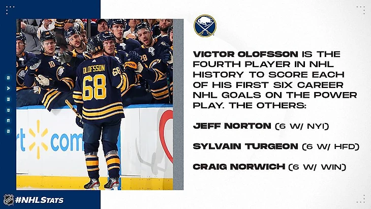 Форвард Buffalo Sabres Виктор Олофссон, забросивший вчера свою 6-ю шайбу в заокеанской карьере, установил довольно интересный рекорд, став 4-м хоккеистом в истории лиги, который все первые свои 6 шайб в НХЛ забросил реализовав численное большинство своей команды. Такой интересный статистический факт имеется на счету Джеффа Нортона, Сильвен Туржон, и Крэйг Норвич;