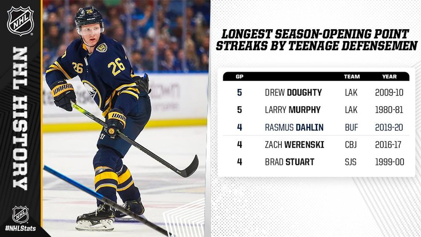 Защитник Buffalo Sabres Расмус Далин на старте сезона продолжает обновлять статистические показатели: на этот раз, оформив два ассиста в своем последнем матче, Расмус довел свою серию с набранными очками до 4-х матчей, а это означает, что только два защитника в его возрасте имели серии длиннее: Дрю Даути (2009-2010) и Ларри Мёрфи (1980-1981) имеют 5-ти матчевые серии с набранными очками;
