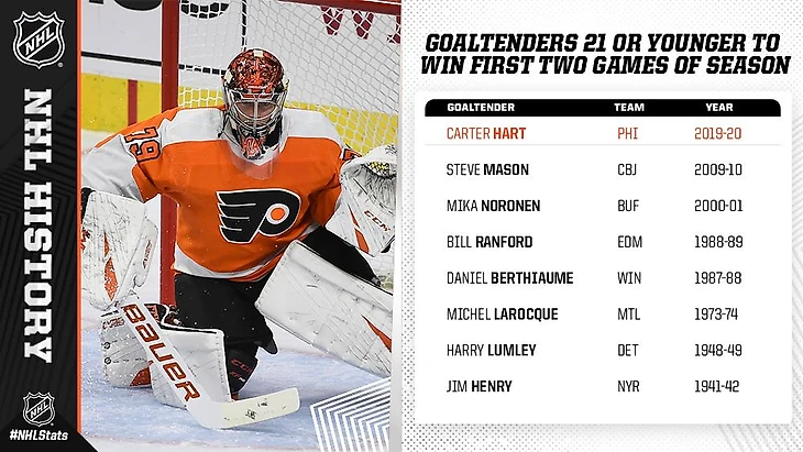 Голкипер Philadelphia Flyers Картер Харт стал восьмым вратарем в истории НХЛ в возрасте 21 года и младше, которым удавалось выиграть первые две игры регулярного сезона;