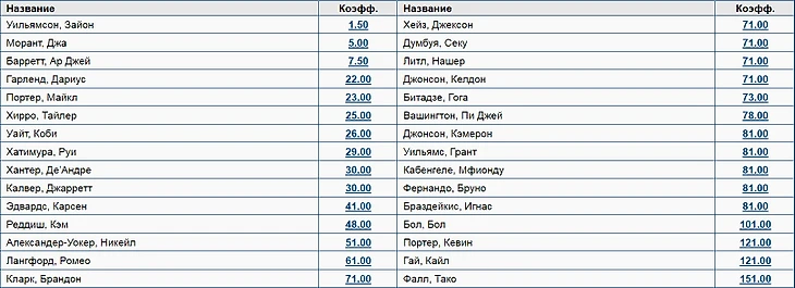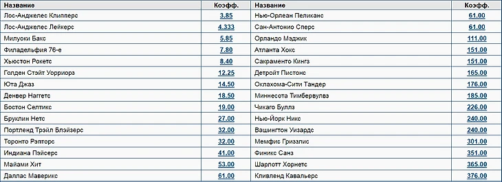 Всем привет! До старта лучшей баскетбольной лиги в мире осталось чуть более трёх дней, но прямо сейчас вы уже можете предугадать исход сезона. Представляю к вашему вниманию котировки, которые взяты из букмекерской конторы "Марафон" на итоги NBA в сезоне 2019-2020, а также то, чтобы я рассмотрел сам. Интересно будет к концу сезона вернуться к этому посту и посмотреть, сколько же давали на то или иное событие.