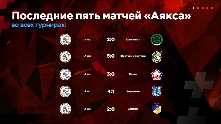 Голландцы после продажи своих лидеров ничуть не сбавили. Первое место в чемпионате и в группе ЛЧ (с показателем 6-0). Последний официальный матч, который проиграли подопечные Тен Хага был тот самый против “Тоттенхэма” (2:3 с хет-триком Моуры). Более того, за десять игр амстердамцы пропустили всего четыре гола, а забили 28.