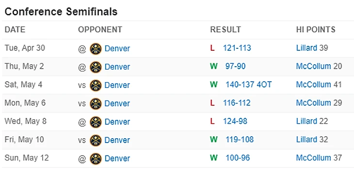 Портленд прошел в 7 матчах, выиграв последний в Денвере 96-100, с итоговыми 37 очками от МакКолума, откровенно говоря Портленд для мяня чудом выиграл ту серию, я не понимаю как можно было выиграть когда у тебя в составе