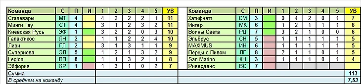 Лучшие команды раунда по сумме УВ в целом: Сталевары, Минги Тау (по 11 вариантов)