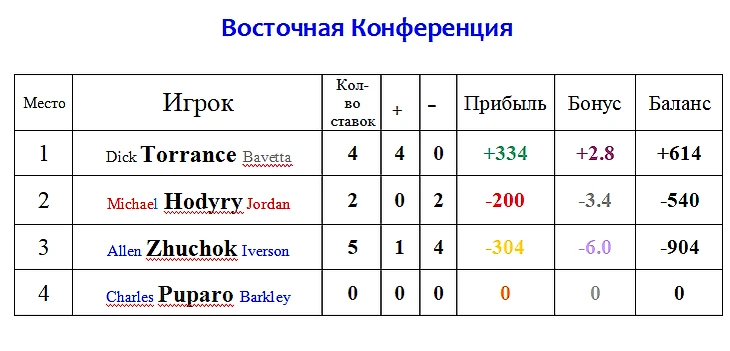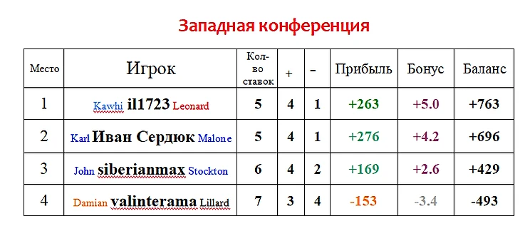 На западе пока настоящая заруба. И Ваня, siberianmax и Ильяс были в одной верной ставке от бонуса +100 к балансу (дается за 5 подряд верняков), но Ильяс и siberianmax уже этой ночью могут выбить бонус. Ильяс довольно умело щелкает четверти и половины, за чем интересно понаблюдать. Valinterama ставит очень полярно. Достиг двух отрицательных лимитов бонуса, при этом с запасом зашел ТБ в игре Миньки с ГС. и пробил лимит максимума бонусов в игре ЛАК-Портленд, грамотно предсказав ТМ в этой игре.