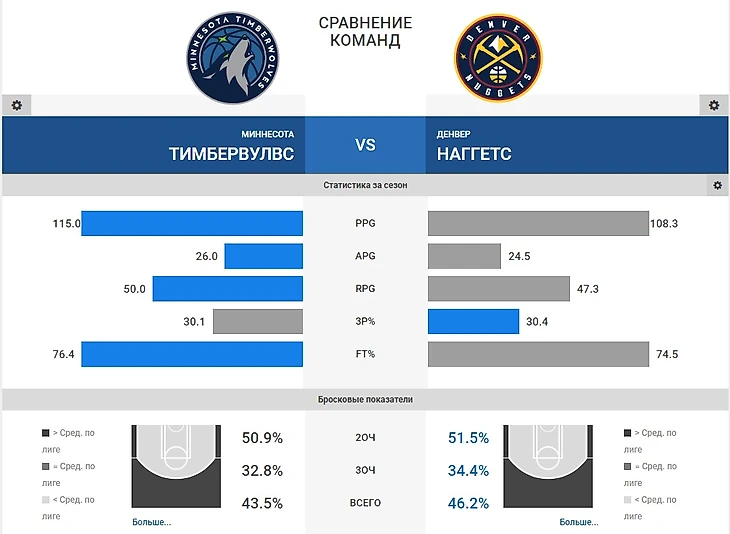 Что касается центрового "Денвера", то он набирает в среднем 16.3 очка, бросая с 45.9%-ой точности, включая 26.5% трёхочковых попаданий и 77.8% со штрафных бросков за 30.6 минут в среднем за игру.