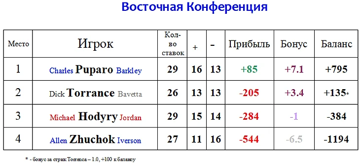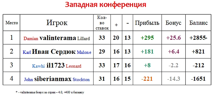 Хорошо отыграли лишь лидеры Западной конференции. Valinterama, по традиции, поймал тотал выше в игре Финикс-САК, достигнув при этом лимита бонусов. А Ваня Сердюк поставил на ТМ Портленда и поверил в Оклу, взял плюсовую фору. Оклахома часто играет близко даже с сильными соперниками, так что +10.5 хватило с запасом.