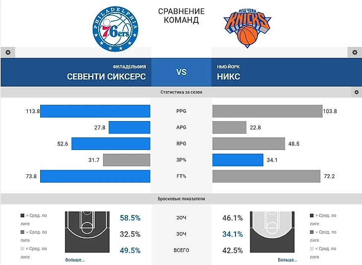 Темп команды из «Нью-Йорка» оставляет желать лучшего, забивает 102 очка и пропускает 109 очков в среднем за игру. Но в этом матче всё же сделаю упор на атакующие качества «Сиксерс», которые частенько выдают приличные перфомансы и если не сегодня, после трёх дней отдыха и с таким соперником, то когда?. Вот-вот.