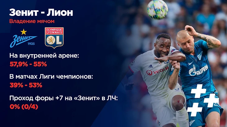 Сухая статистика: ни в одном из четырех поединков Лиги чемпионов этого сезона "Зенит" не имел преимущество перед соперником в показателе владения мячом. Более того, "сине-бело-голубые" остановились на средней отметке 39%, что является одним из самых худших результатов сезона 2019/2020. Что касается "Лиона", то здесь все гораздо лучше: 53% в среднем в поединках главного клубного турнира Старого Света, а также 55% на внутренней арене. "Зенит" дома отдал мяч "РБ Лейпцигу" и "Бенфике", а на выезде выглядел немного лучше. Думаем, что подобная тенденция продолжится и в ближайшей встрече.