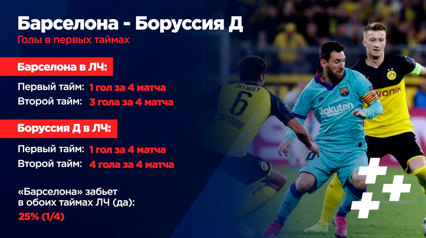 Почему в домашнем матче против "Боруссии" все должно быть иначе? Тем более, что именно гости приедут с желанием сбросить с хвоста миланский "Интер", который, хоть и отстал уже на три очка в таблице, все еще сохраняет хорошие шансы на выход в плей-офф. Интересно, что сами дортмундцы в Лиге чемпионов тоже лишь однажды в этом сезоне забивали в первом тайме, а было это вновь в выездной игре против "Славии". Но давайте отталкиваться всеми частями тела именно от каталонского клуба.