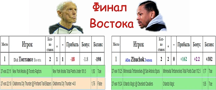 Бекзат дал Ивану игры Майами-Хьюстон и Атланта-Милуоки, на которые Ваня поставил следующим образом - ТМ Атланты и ТБ в игре Майами-Хью. Несмотря на феерию Джабари в 1-ой половине, который забил 27 очков, попадая даже трехи...во 2-ой Бакс прижали Атланту, дав ей забить всего 43. На игру в Хьюстоне же тотал зашел впритык! И то благодаря аж 40 очкам Майами в последней четверти. Хьюстон откровенно доигрывал и не напрягался. Valinterama же поймал победу своего Портленда, но обжегся на Чикаго, поверив что те смогут одолеть на выезде злых ГС.