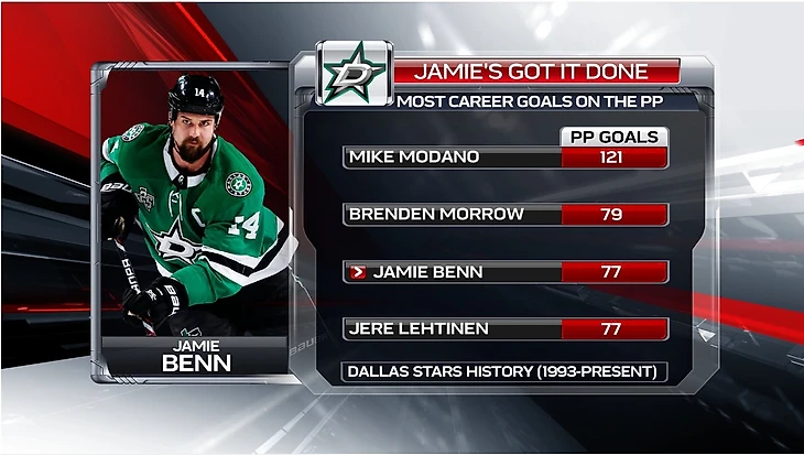 Форвард Dallas Stars Джейми Бенн делит 3-е место в списке снайперов Старз при игре в "большинстве" (после переезда клуба в Даллас);