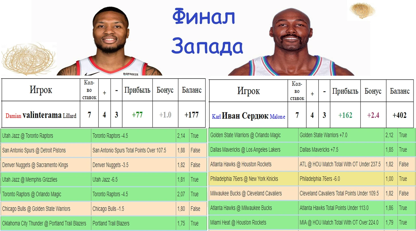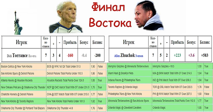 На востоке же Zhuchok также дал 2 из 2. ТБ на игру Майами-Бруклин зашел в очко (уже второй за серию!), однако даже если б не зашла эта ставка, то в финал бы его вывела ставка на плюсовую фору Мишек, которая зашла с запасом. У меня же обе ставки не зашли, выдохся я=)) Оба ТМ не зашли конкретно, и Жучок победил 4-3 (5-3 с учетом запасных игр).