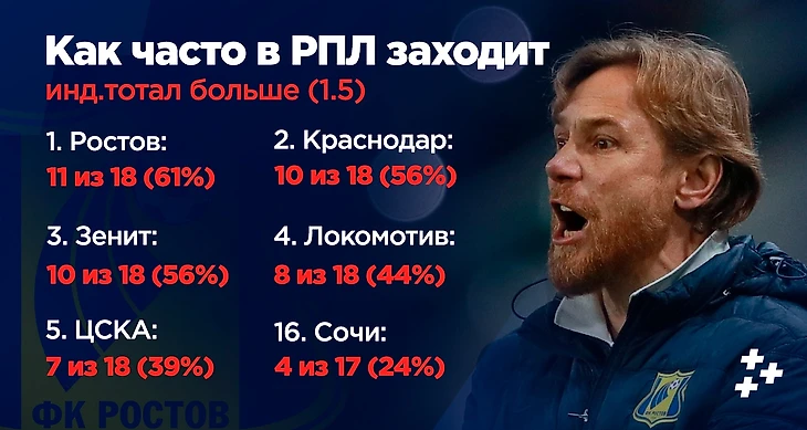 Помимо этих преимуществ у “Ростова” есть крутой тренд, который срабатывал в 61% игр в текущем сезоне. В 11 из 18 встреч команда Карпина пробивала индивидуальный тотал больше 1,5. Такая атака позволяет делать это регулярно и тут вообще нечему удивляться. “Ростов” лидирует по этому показателю, опережая даже “Краснодар” с его атакующей философией (10/18, 56% заходов). Причем дончане выбивали этот показатель даже с выездных играх с лидерами: ЦСКА (3:1), “Краснодаром” (2:2) и “Локомотивом” (2:1). Куда сложнее им приходится с середняками и аутсайдерами, которые выкапывают ров у своих ворот. 1:2 с “Тамбовом” (дважды), 0:2 с “Уфой”, 1:0 с “Крыльями”.
