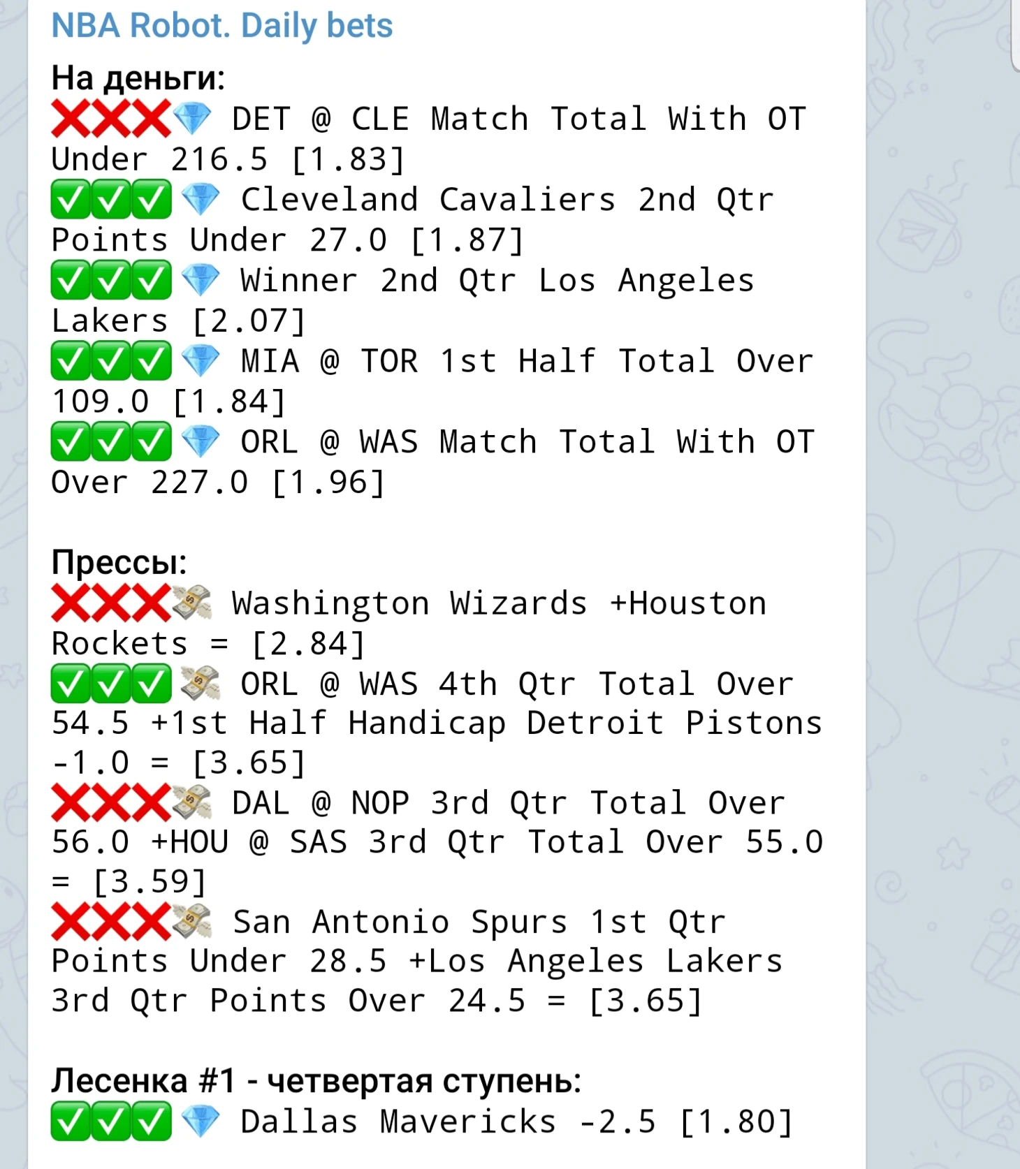 Помимо этого, с помощью Stierlitz18, у РОБОТа появился и поддерживается рассылка на бетоне, там вы можете купить ставки как индивидульно так и по пакетам, ставки могут немного отличаться от того что выходит в основном пакете в телеграме, в основном связанно с временной заддержкой по вводу прогнозов на бетоне, ведь тоталы могут меняться.