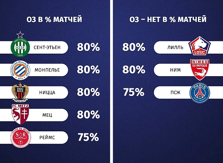 «Монпелье», «Ницца» и «Сент-Этьен» показали яркий и голевой футбол, что дало им тенденцию на верховой исход матчей с обоюдными голами; перерыва (70% мячей).