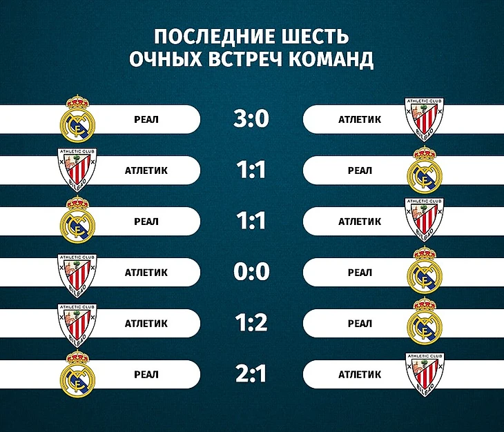 Мадридцы уверенно возглавляют таблицу xG (35,58), но вот с реализацией не все в порядке, они забили меньше своих прямых конкурентов («Барсы») на десять мячей. Это серьезное отставание. Вообще, более трёх голов в играх между «Атлетиком» и «Реалом» не забивалось уже почти четыре года. Вот последние шесть встреч между ними: