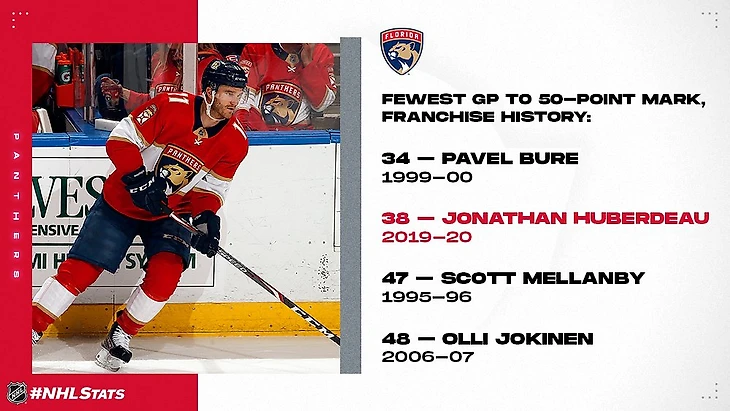 Форвард Florida Panthers Джонатан Юбердо стал вторым хоккеистом в истории франшизы, которому удалось достичь показателя 50 очков за 38 или менее матчей регулярного чемпионата;