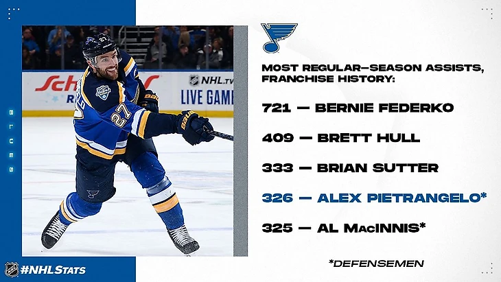 Защитник St. Louis Blues Алекс Пьетранджело в сегодняшнем домашнем матче vs. Winnipeg Jets (4:1) отметился результативной передачей, которая стала для него 326-й в карьере, что позволило ему сместить с 4-й позиции рейтинга лучших защитников ассистентов франшизы Ала МакИнниса;