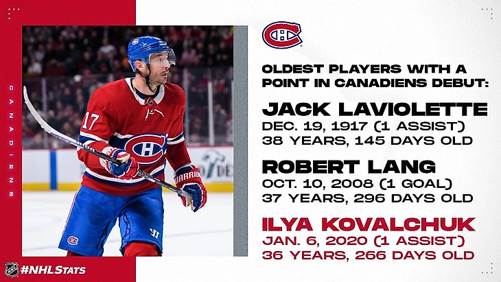 Российский форвард Canadiens Montréal Илья Ковальчук является 3-м по возрасту хоккеистом франшизы, которому удавалось отличиться набранным очком в своем дебютном матче за команду;