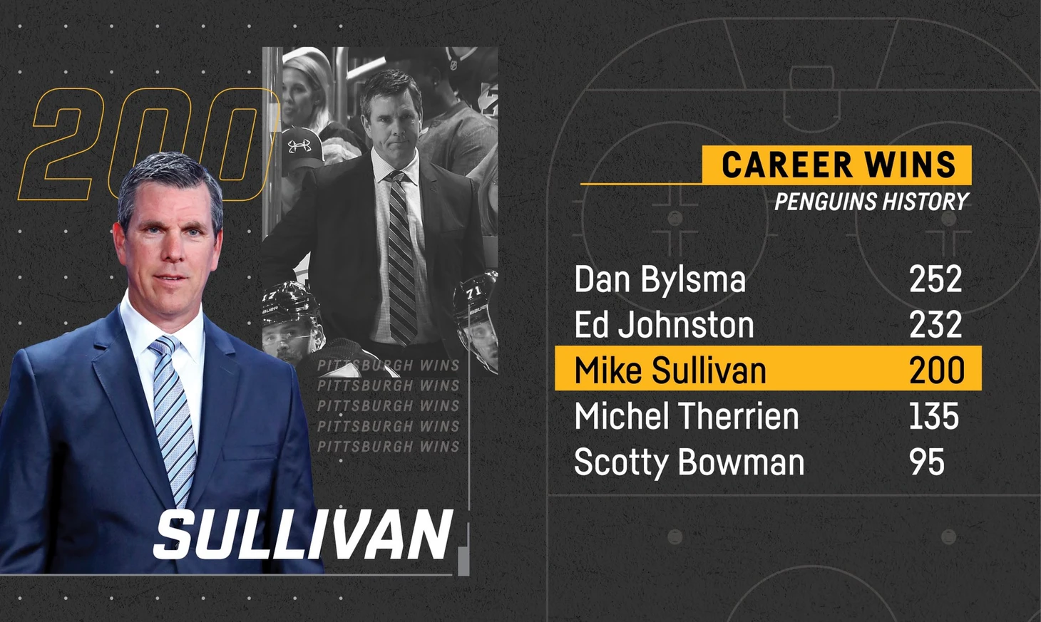 После сегодняшней победы (vs. Vegas Golden Knights 3:4) Майк Салливан стал 3-м главным тренером в истории Pittsburgh Penguins, которому удалось выиграть 200 матчей регулярного чемпионата с Penguins;