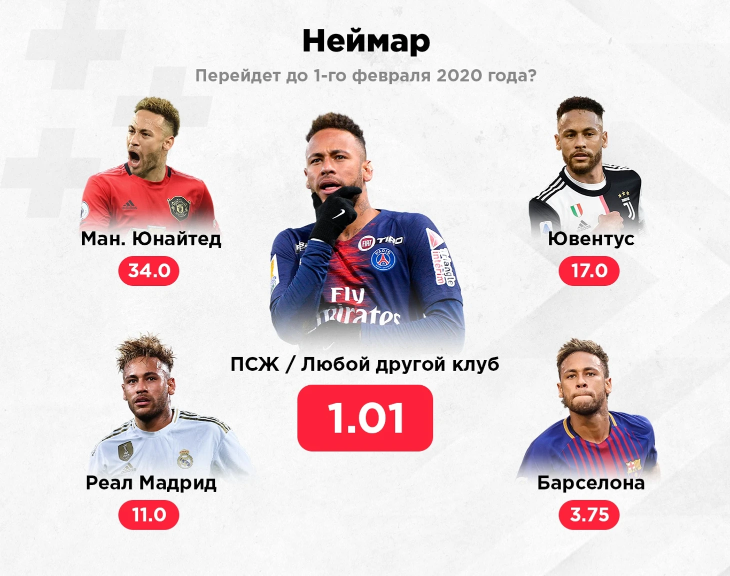 Букмекерские конторы приняли во внимание многочисленные слухи, фигурировавшие в течение всего прошлого года, выкатив котировки на возможный уход Неймара в "Манчестер Юнайтед" (34.0), "Ювентус" (17.0), а также "Реал" (11.0). Но даже для такой противоречивой личности подобные варианты относятся к области фантастики.
