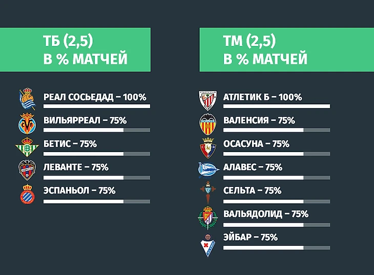 Все из списка верховых команд были и в прошлый раз, абсолютно (-ли) все. Зато в правом столбце мы видим сразу четыре коллектива, сменивших курс на менее результативную игру: «Валенсия», «Осасуна», «Алавес» и «Эйбар». Здесь также завсегдатай тотала меньше – «Атлетик Бильбао». За весь чемпионат у басков было всего четыре верховых матча. «Вальядолид» недалеко ушел – пять из двадцати встреч закончились низом.