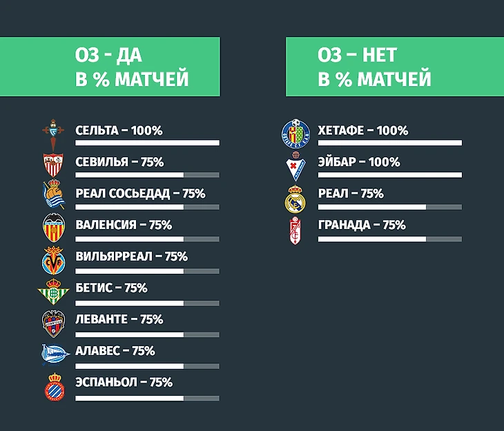 А вот по ТБ и ОЗ у нас сразу пять совпадений. Все коллективы, играющие верх, зачастую делали это ещё и с обоюдными голами. Просто праздник какой-то!