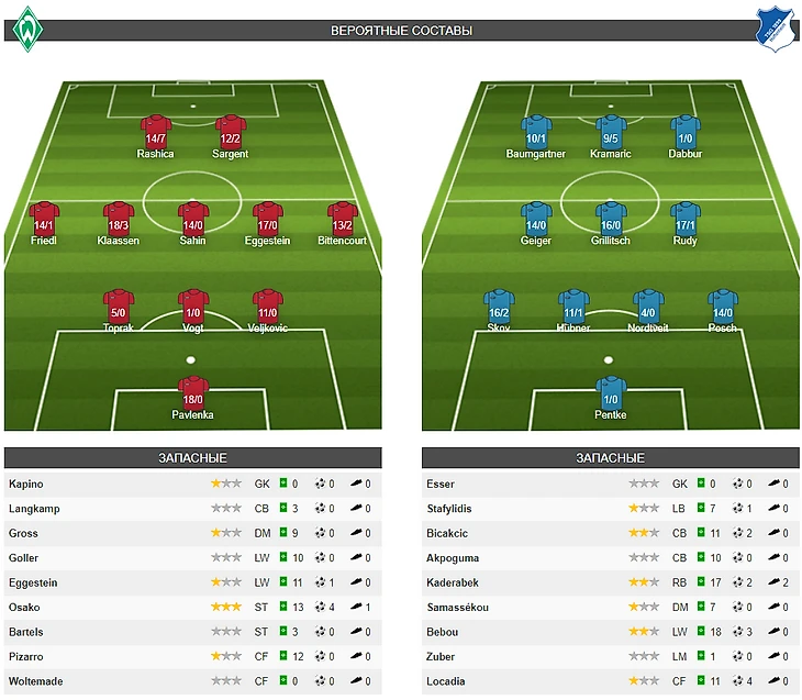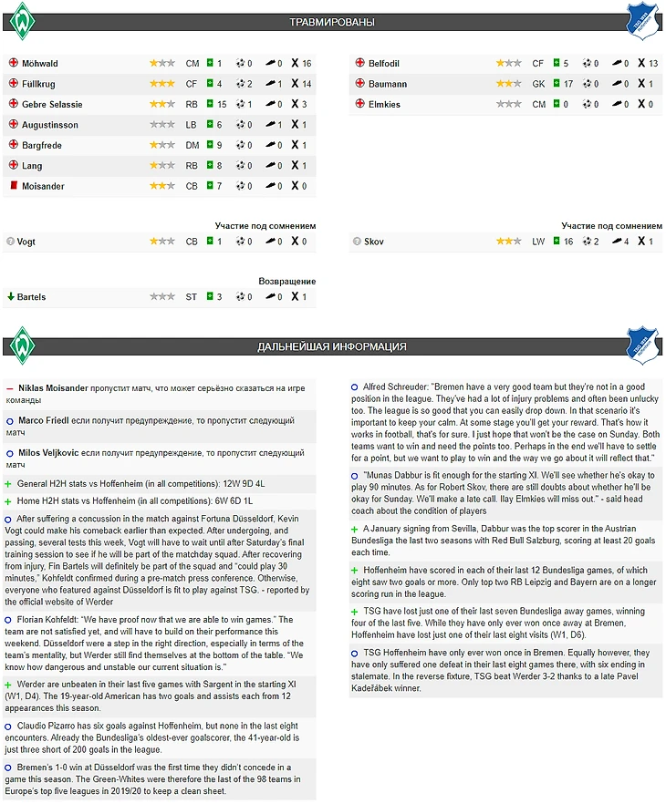 Продолжаем исследовать внутренние дела европейских команд 👇 На этот раз мой взгляд привлек завтрашний матч между «Вердером» и «Хоффенхаймом».