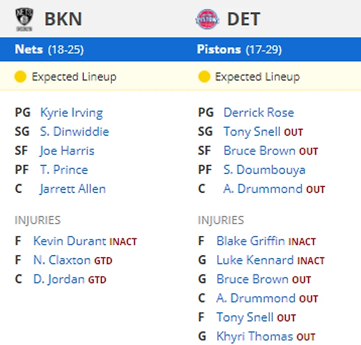 Бруклин показывает результаты ниже ожидаемых, команда проиграла 5 матчей к ряду, и уже Кенни Аткинсон не выглядит сильным тренером, травмы Ирвинга и Леверта отразились на команде, но есть люди, считающие, что от Ирвинга будет только вред, но если вынести за скобки его поведение на публике и спорные высказывания в прессе, Кайри как и раньше очень хорошо влияет на атаку команды, хоть и передерживает мяч, c ним на паркете атакующий рейтинг команды на 7 пунктов выше, чем без него, сегодня у Детройта не сыграет Брюс Браун, сильнейший защитник команды против бэккорта соперника, отсутствие Андре Драммонда это очевидная проблема для Детройта на щитах, Бруклин несмотря на все сложности выглядит уверенным фаворитом в матче с Детройтом, который проведёт второй матч за двое суток, хоть и никуда не переезжая