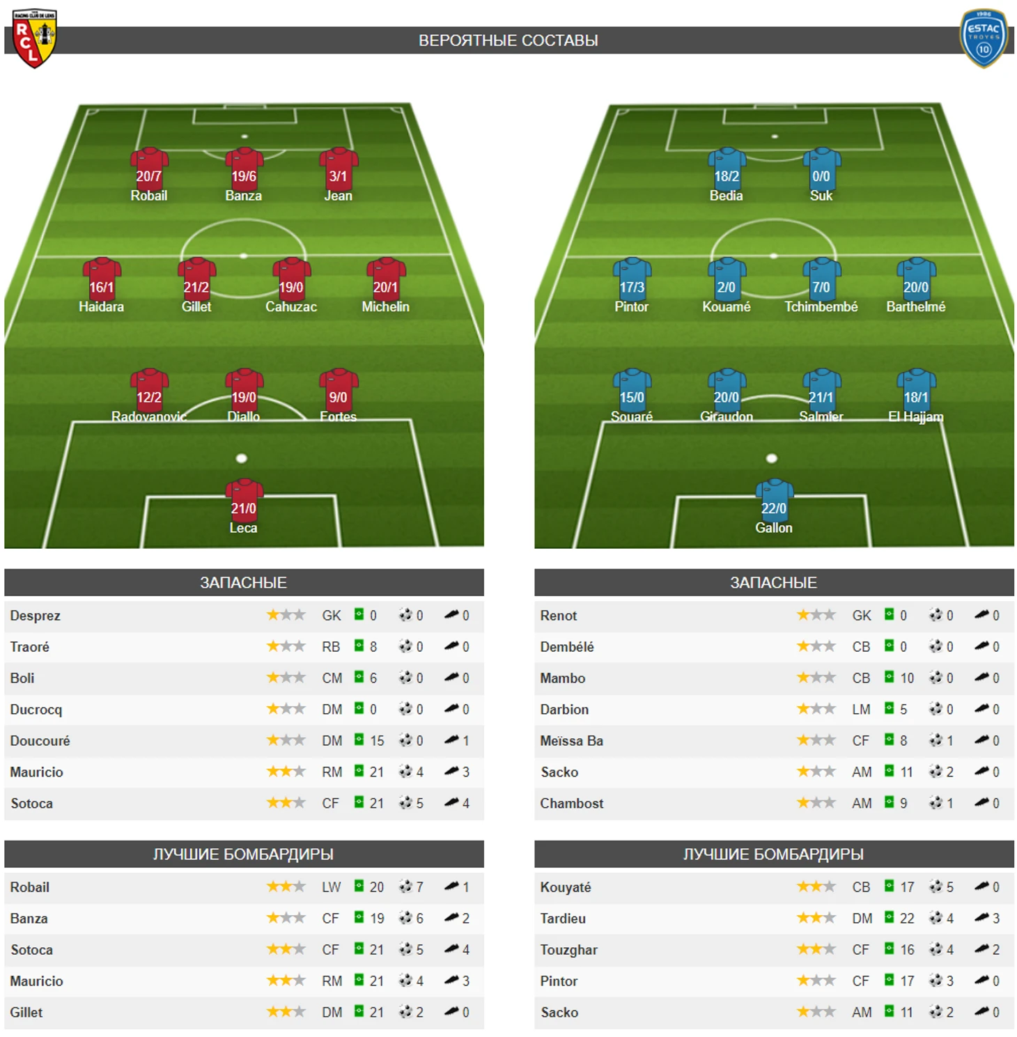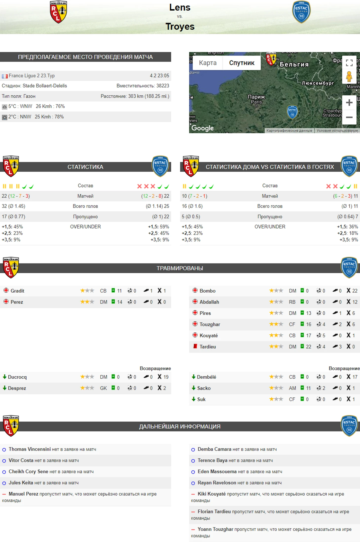 У «Труа» будут отсутствовать 5 важных игроков: Yoann Touzghar (нападающий, 16 появлений / 4 гола / 2 ассиста), Kiki Kouyaté (защитник, 17/5/0), Florian Tardieu (полузащитник, 22/4/3), Rui Pires (полузащитник, 13/0/1), Rayan Raveloson (полузащитник, 19/0/1). Иными словами, за гостей не сыграют 3 лучших форварда команды (в чемпионате у них на троих 13 голов из 25 всего забитых командой).