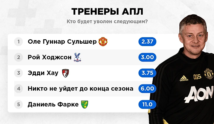 Оле Гуннар Сульшер должен сотворить небольшое чудо, чтобы сохранить свой пост. Возможно, таким чудом станет квалификация в Лигу чемпионов по итогам сезона, но будет ли у него достаточно времени для этого? Большинство букмекеров не верят в подобное. "Оле Гуннар Сульшер — следующий на выход", такое пари готовы заключить с коэффициентом 2,37 прямо сейчас.