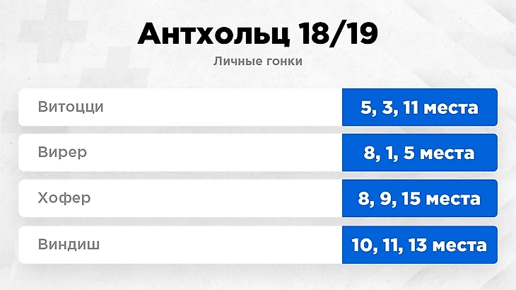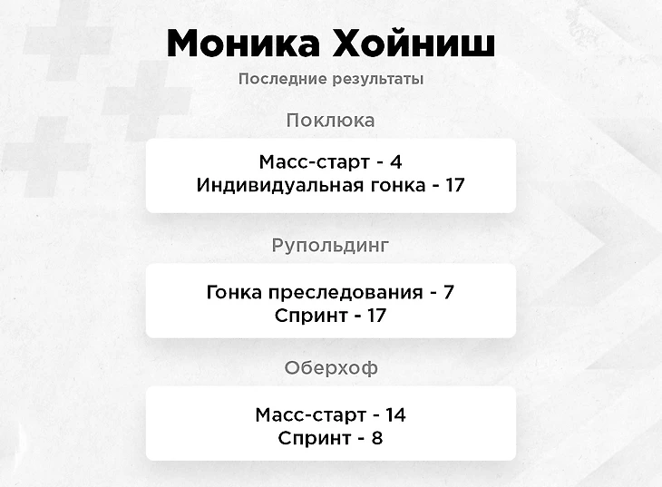 У женщин с фаворитами все понятно, понаблюдать же интересно будет за Моникой Хойниш. В прошлом сезоне она бежала здесь две гонки, в обеих была шестой по скорости, в спринте попала в цветы. Моника достаточно опытная спортсменка, и в Антхольце всегда выступала стабильно. Стабильность — это очень подходящее слово и для нынешней формы спортсменки. Начиная с немецких этапов она ни разу не падала за пределы топ-17.