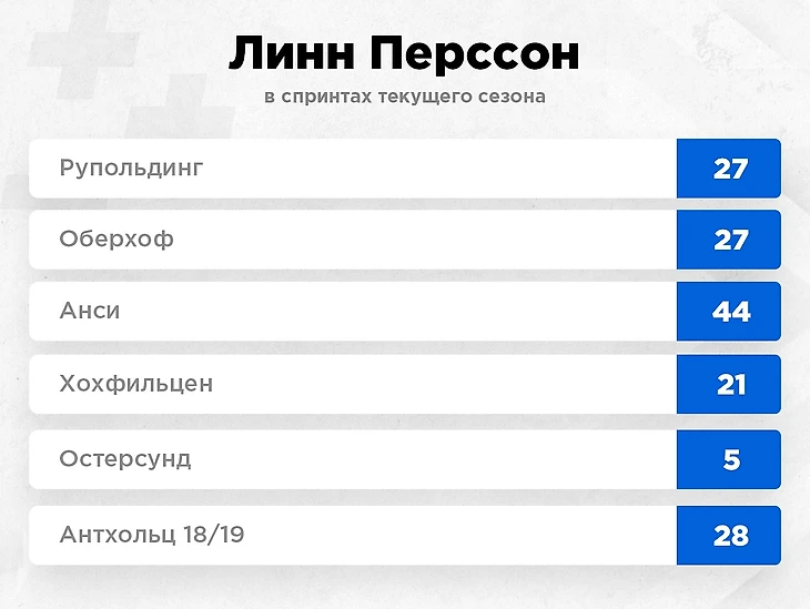 Было пятое место в Остерсунде, где вся сборная Швеции выглядела выше своих возможностей, но затем четыре гонки за пределами двадцатки. Ну и результаты Линн в среднегорье тоже не впечатляют. В прошлом году сборная Швеции тут отравилась, и у Перссон только одна гонка, где она стала 28-й.