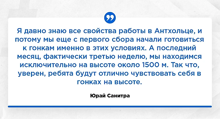 На счет особенностей спортсменов, акклиматизации, гипоксии, габаритов, и вот этого всего, выскажу не особо популярную мысль. Да, все мы понимаем, что все это имеет место быть. Однако нужно также учитывать, что биатлонисты планомерно готовились к этому старту, и это не тот случай, когда горный этап идет просто где-то посреди сезона. Это главный старт года, сборная России вот, например, готовилась в Риднау, где тоже высота под 1500 м. Горы, конечно, скажутся, но я не думаю, что сыграют очень серьезную роль, как это обычно бывает. Тут есть две недели на адаптацию. Плюс ко всему, место проведения чемпионата мира команды узнали не вчера. Для примера приведу слова наставника сборной Украины: