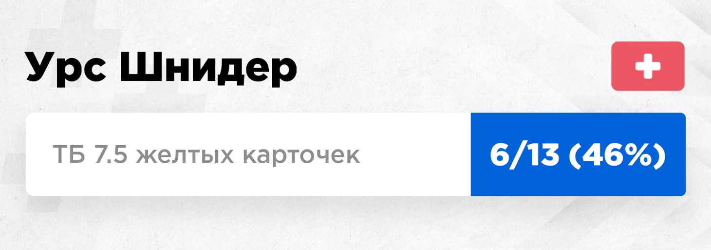 Один из двух самых верховых судей чемпионата Швейцарии в этом сезоне. В прошлом сезоне тоже был в топ-3. Его средний тотал в районе 6, но при этом он все равно регулярно выдает матчи с очень большим количеством карт. Я думаю понятно, что суть этой подборки именно в возможности ловить большие коэффициенты, потому что средние плечи, например, в Швейцарии, в районе 5.5 ЖК. Тут интересны как раз такие персонажи, как Шнидер, у которых среднее значение в рамках разумного, но при этом все равно достаточно суперверховых матчей.