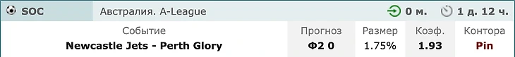 2) Мельбурн Сити - Брисбен Роар. Хочу посмотреть на Сити. Как они будут действовать в условиях, когда им необходима победа. Однако Роар не такой простой соперник. В прошлом матче с Перт Глори команда во втором тайме показала достаточно интересный футбол, полностью проиграв в первом. На этот матч у меня есть два варианта для прогноза. Ф2 (+1). Мельбурн Сити из 8 матчей 5 выиграл с разницей в 1 мяч; 1 матч выиграл с разницей в 2 мяча; два раза проиграл и один раз была ничья. Таким образом, имеем: 5 возвратов; 1 поражение; 3 победы. Брисбен Роар в гостях имеет следующую статистику по данной ставке: 6 побед; 1 поражение; 2 возврата. Коэффициент ф2(+1) от 1.75 до 1.8. По-моему, достаточно неплохо. Однако сам я не буду брать в прематче и посмотрю первый тайм или хотя бы первые 20 минут.