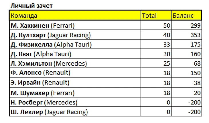 Личный зачет после 4 гонок и 2 этапов. Хаккинен отпраздновал уже 2 победы в 2 гонках и сместил Култхарда на первой строчке протокола. Также стоит отметить, что подтянулись Альфа Таури, 4 из 4 финиша у команды, а также всего двое пилотов не набрали очков, поэтому ждем в ближайшее время от них подиума!