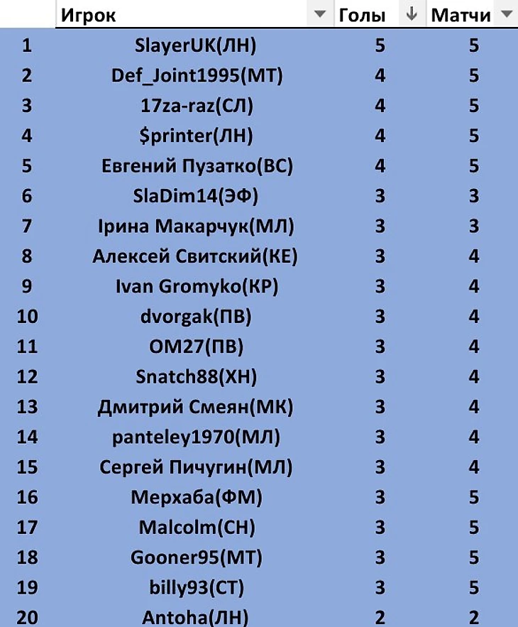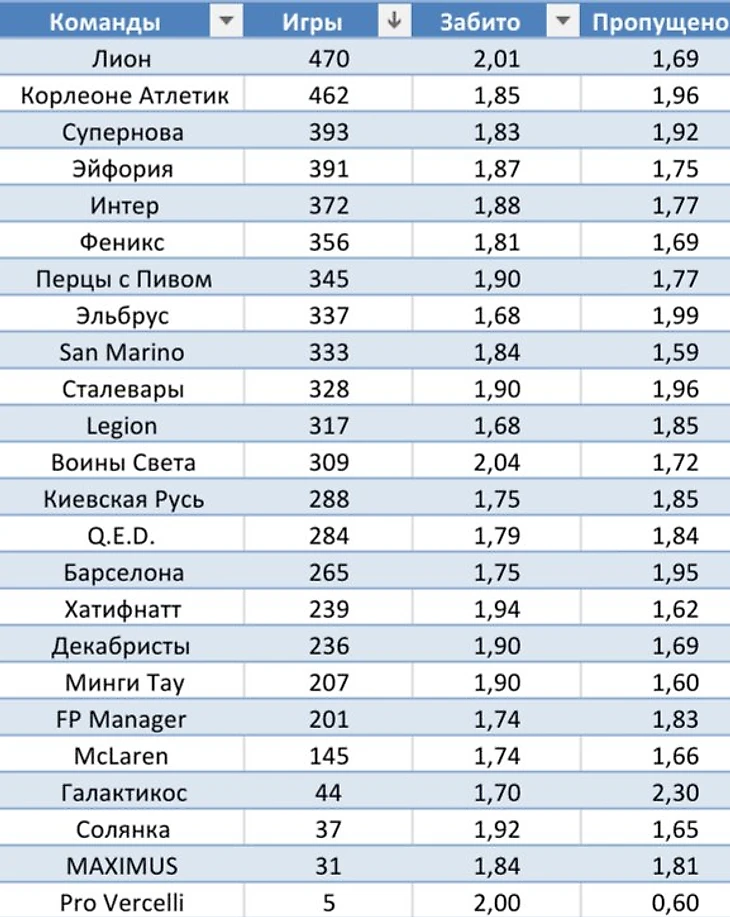 Лишь две команды (без учёта новых коллективов) имеют результат больше двух забитых голов за игру. Это Лион (2.01) и Воины Света (внезапно!) (2.04). Несколько команд вплотную подобрались к этой отметке. А вот Legion и Эльбрус имеют наихудший исторический показатель (оба – 1.68).