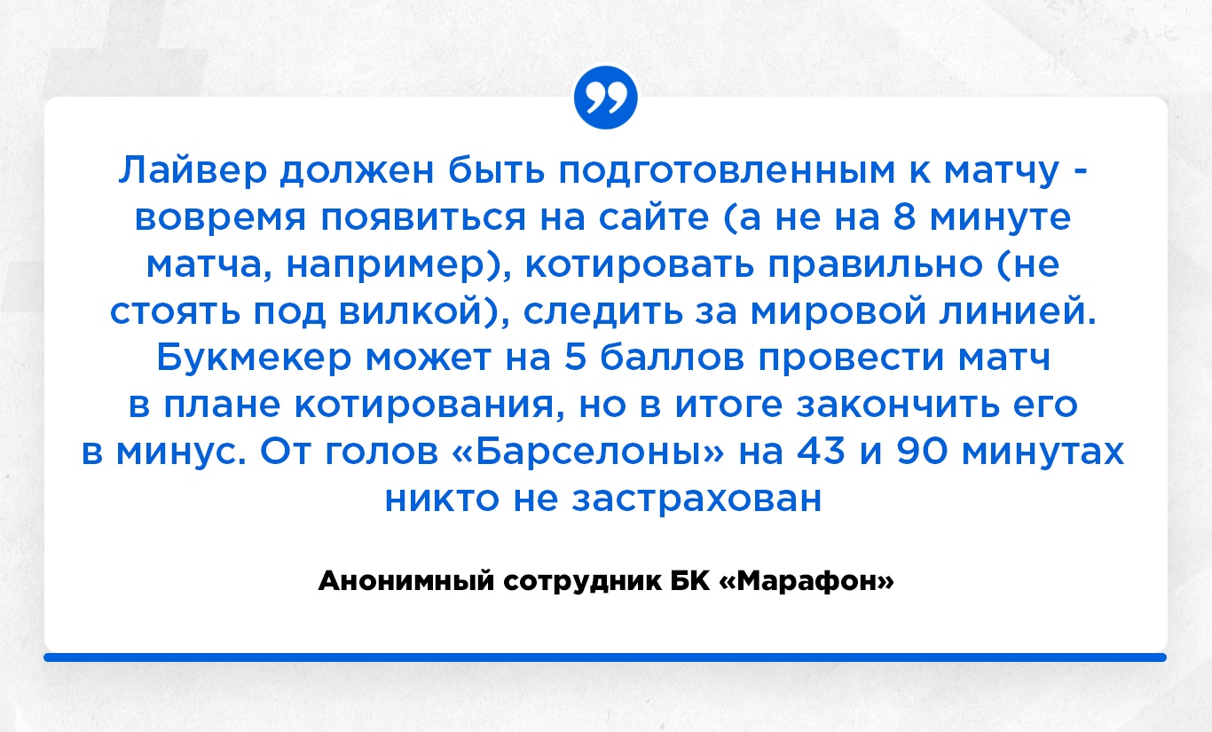 Но перед тем как начнется лайв, необходимо составить линии. Эта миссия возложена на таких называемых трейдеров, которые с помощью специальных программ образуют коэффициенты на все события в БК. Отдел трейдеров выдыхает только тогда, когда матчи переходит в режим лайва. Сколько работы проделано до старта поединка! Порой следишь неделями за одним исходом, чтобы не допустить прогруза.