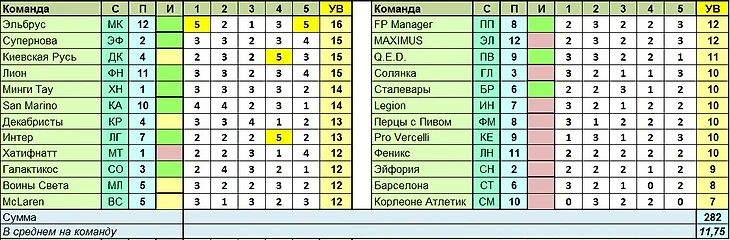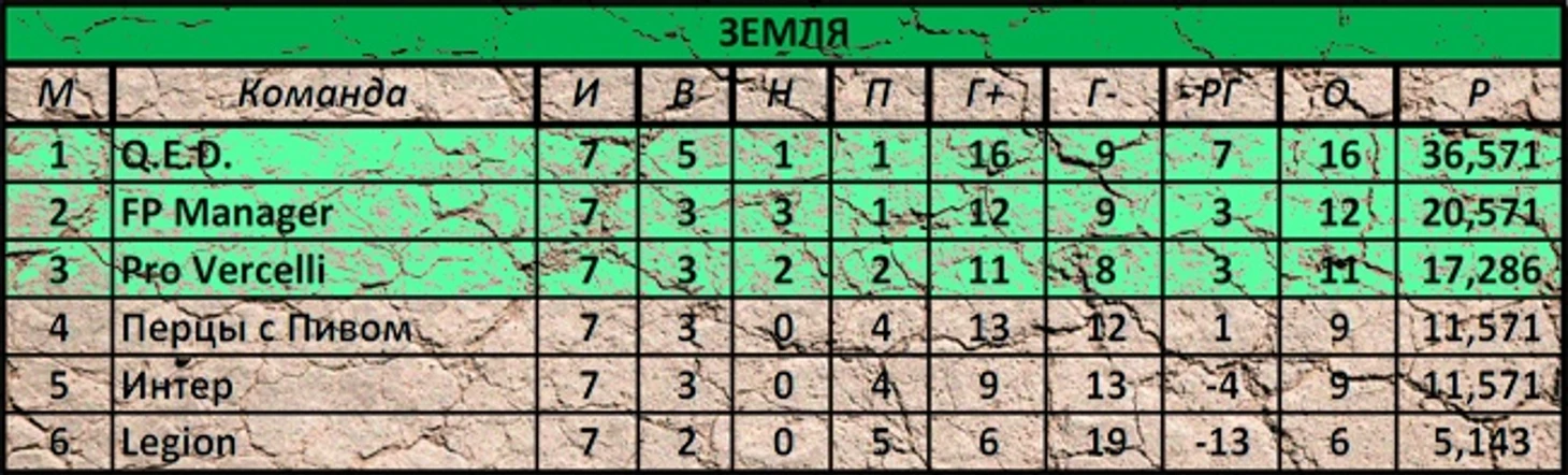 Земля подарила нам три напряжённых поединка, закончившихся с одинаковым счётом 2:1. В ключевом матче тура Перцы проиграли Менеджерам и остались вне заветной тройки. КЕДы обыграли Pro Vercelli, которые чем больше осваиваются в Лиге, тем меньше набирают очков. Новичок остаётся на третьем месте, а вот Q.E.D. выходит в лидеры группы и на второе место в общем зачёте.