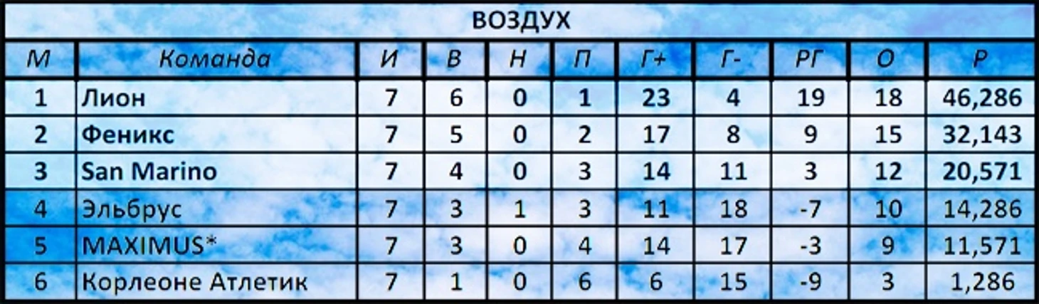 В группе Воздух наоборот наметилось чёткое разделение на фаворитов и аутсайдеров. Лидер чемпионата Лион после досадной осечки в прошлом туре не стал повторять своих ошибок и без шансов разгромил Феникс – 4:0. Эта победа позволила увеличить разрыв от непроходного 4-го места до восьми очков. Которое сейчас занимает Эльбрус.