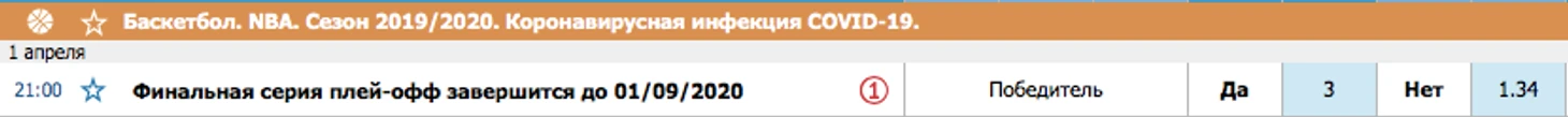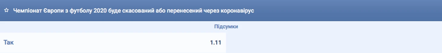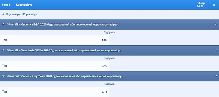 Еще на прошлой неделе букмекеры давали на это большие коэффициенты. Сейчас котировки у некоторых букмекеров упали, другие, как, например, Bingoboom, пока сняли события, связанные с коронавирусом. Очевидно, что пересмотр будет в сторону понижения котировок. Так как то, что считалось невероятным еще пару дней назад, становится все более реальным сейчас.  Пока доступна только одна линия украинского букмекера и выглядит она не так, как вчера. Видимо, события среды, которые включили в себя отказы принять самолет с футболистами "Ромы", неделание ехать на игру в Милан "Хетафе", решение Трампа по авиасообщению со странами шенгенской зоны и приостановка сезона в НБА, а также заражение игрока "Ювентуса" Ругани сделали свое дело.